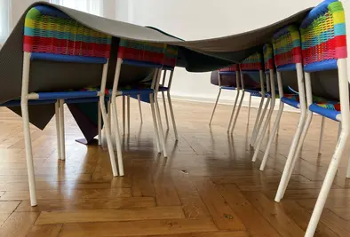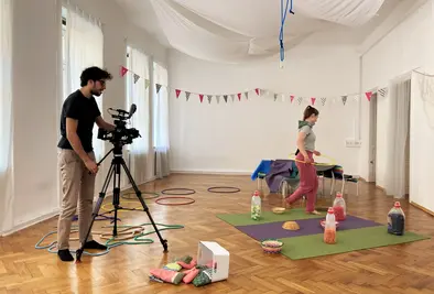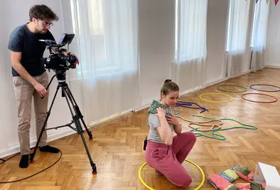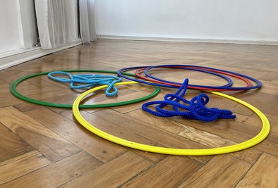 Daniela benutzt für ihren Parcours Sessel und Decken und macht damit einen Tunnel. Ein Hula-Hoop-Reifen wird zu ihrem Ufo und Schnur und Seil ein wackeliger Weg zum Balancieren.