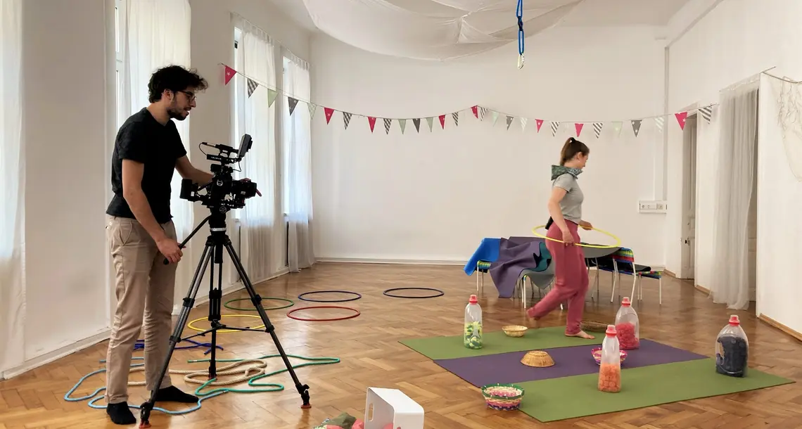 Beim ersten Durchgang probiert Daniela die Stationen aus. Sie kriecht, springt, geht rückwärts und tänzelt auf den Zehenspitzen. Jedes neue Hindernis kann auf mehrere Weisen erlebt werden. Mal stehend oder vielleicht auch mal im Sitzen oder Liegen.