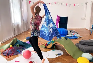Plötzlich wird das Meer etwas unruhiger – spürst du die Wellen, die dich noch mehr durch das Wasser tanzen lassen? Dich im Kreis drehen, hin und her wiegen? (Mit Tuch durch das Wasser tanzen, Drehungen, Wellen erzeugen)