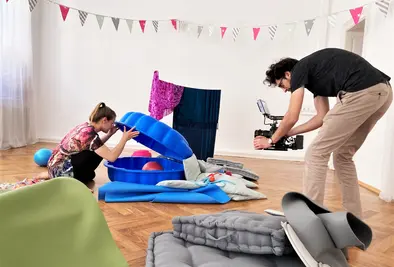 Wenn ihr wollt, holt euch Decken, Tücher, Polster und Stofftiere hinzu, um selbst eine kleine Unterwasserwelt aufzubauen. Da macht es gleich noch viel mehr Spaß, hindurch zu tanzen.