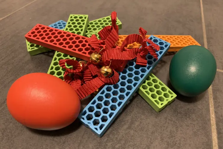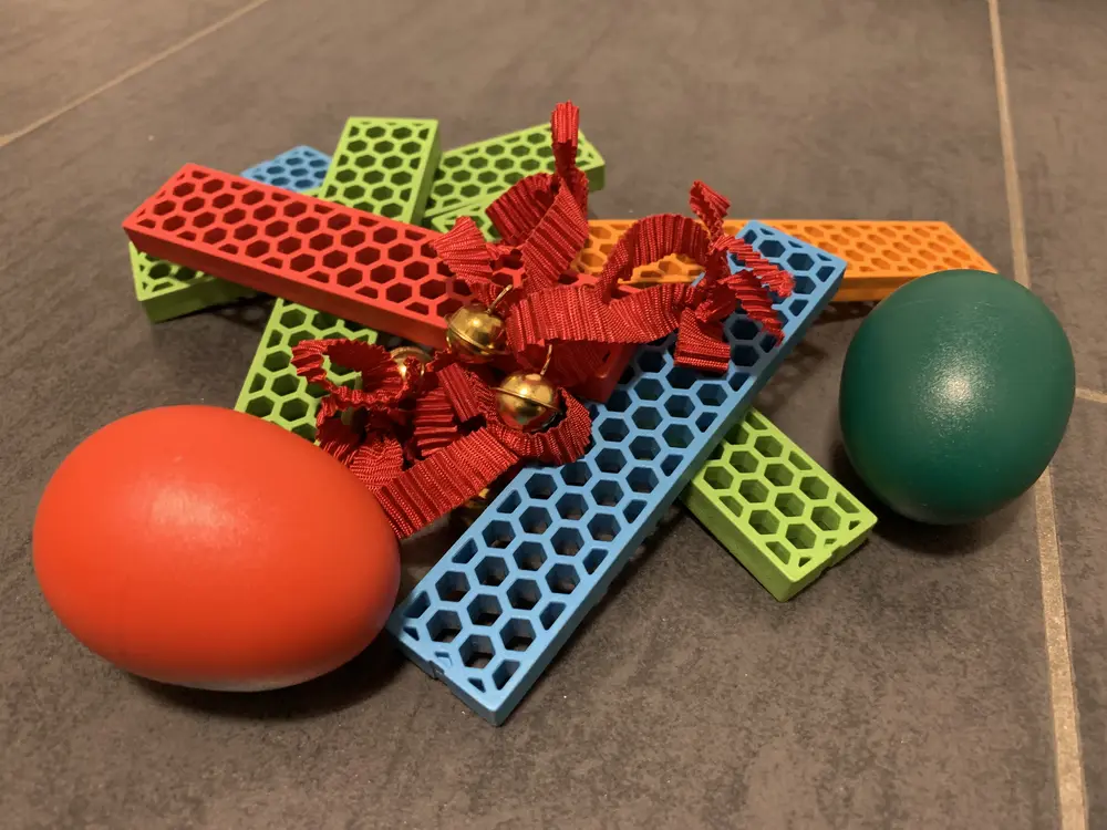 - Rasseln, Rasseleier oder rasselnde Gegenstände (z. B.: Dosen mit Reis, Schachteln mit Linsen)